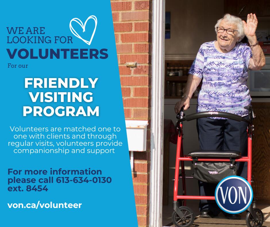 Volunteers are matched with clients and provide one to one friendly visits in the clients home and/or community.